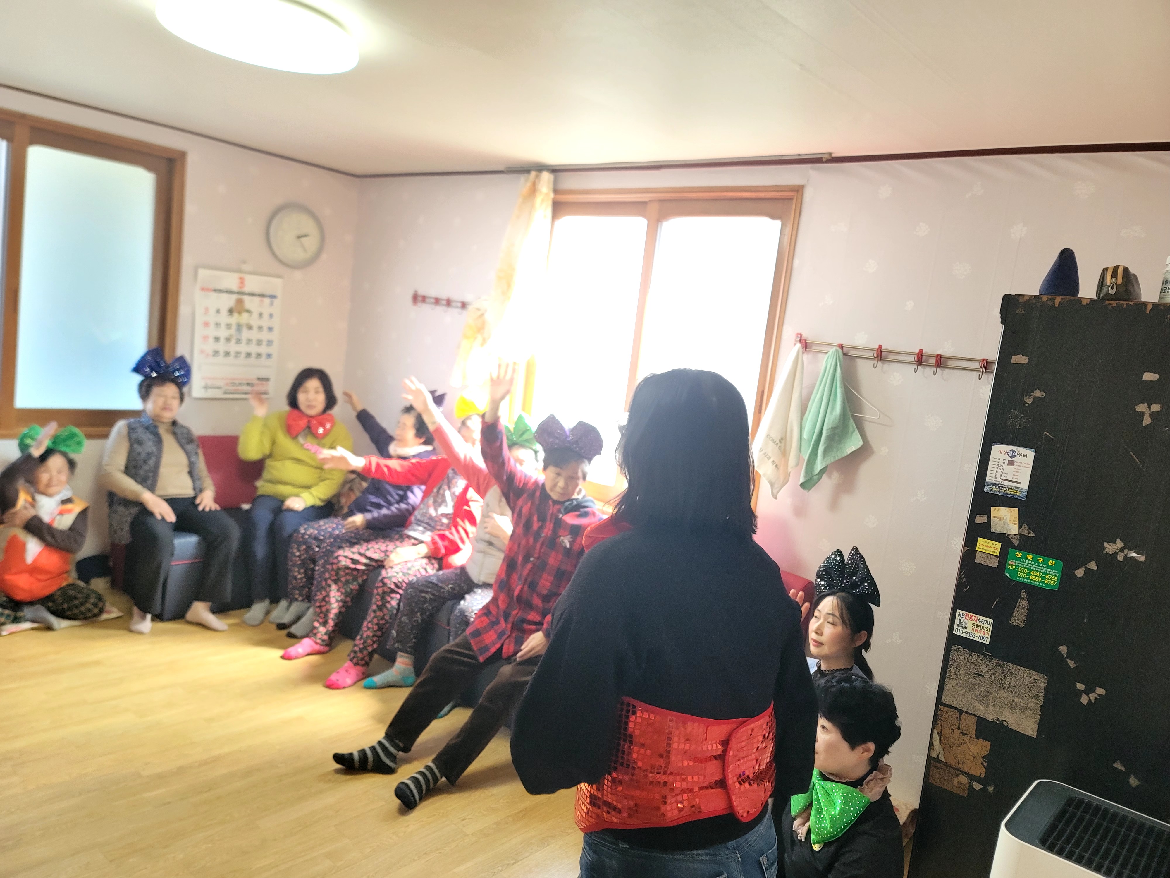 봄바람이 부는 3월 21일 각북면 남산2리 경로당을 찾았습니다. 웃음운동 봉사팀이 온다고 방안에 모여 기다리고 계신 어르신을 위해 손가락박수, 셀프 마사지, 자동차박수, 율동등... 다양한 활동을 하였습니다.