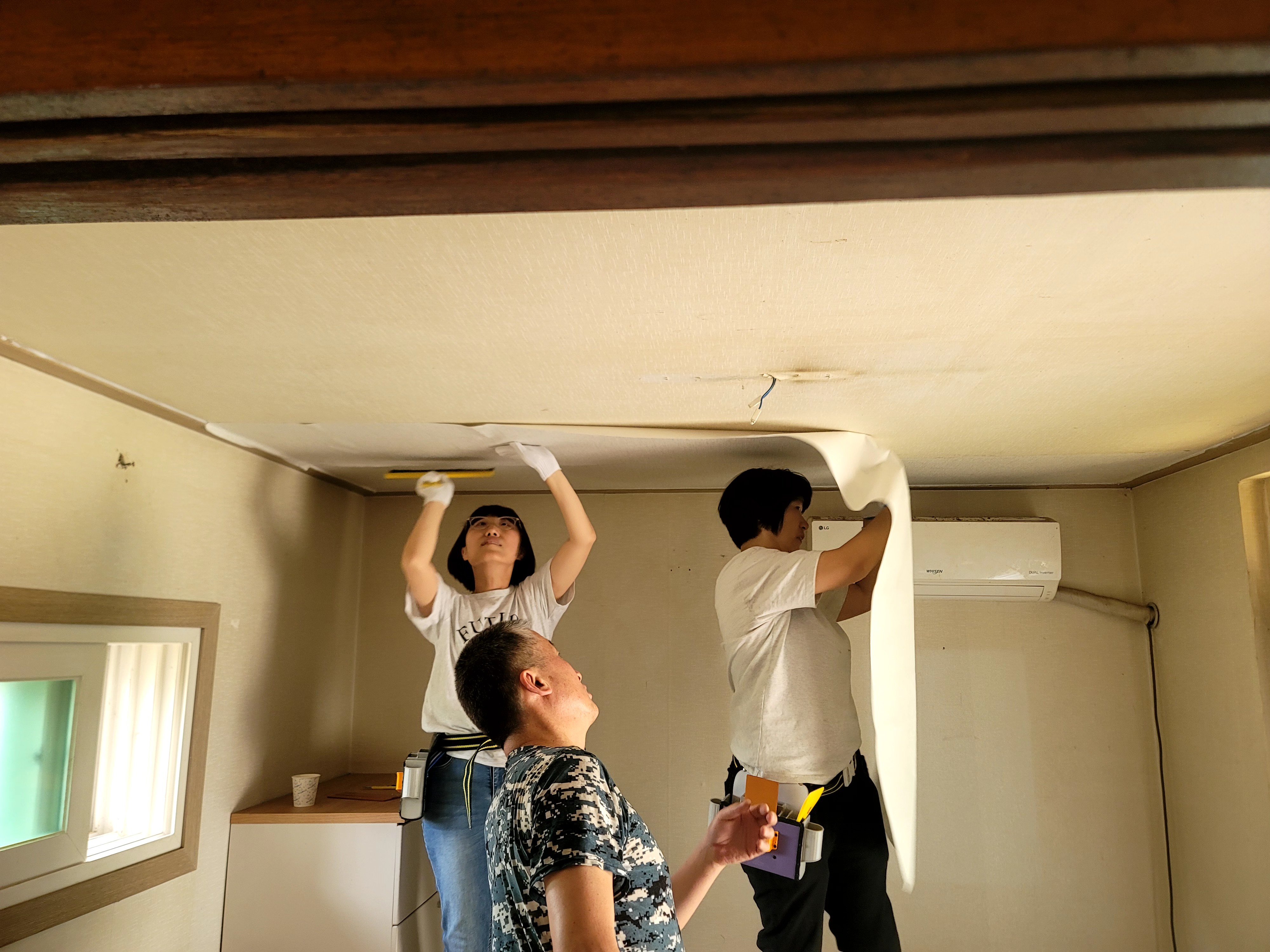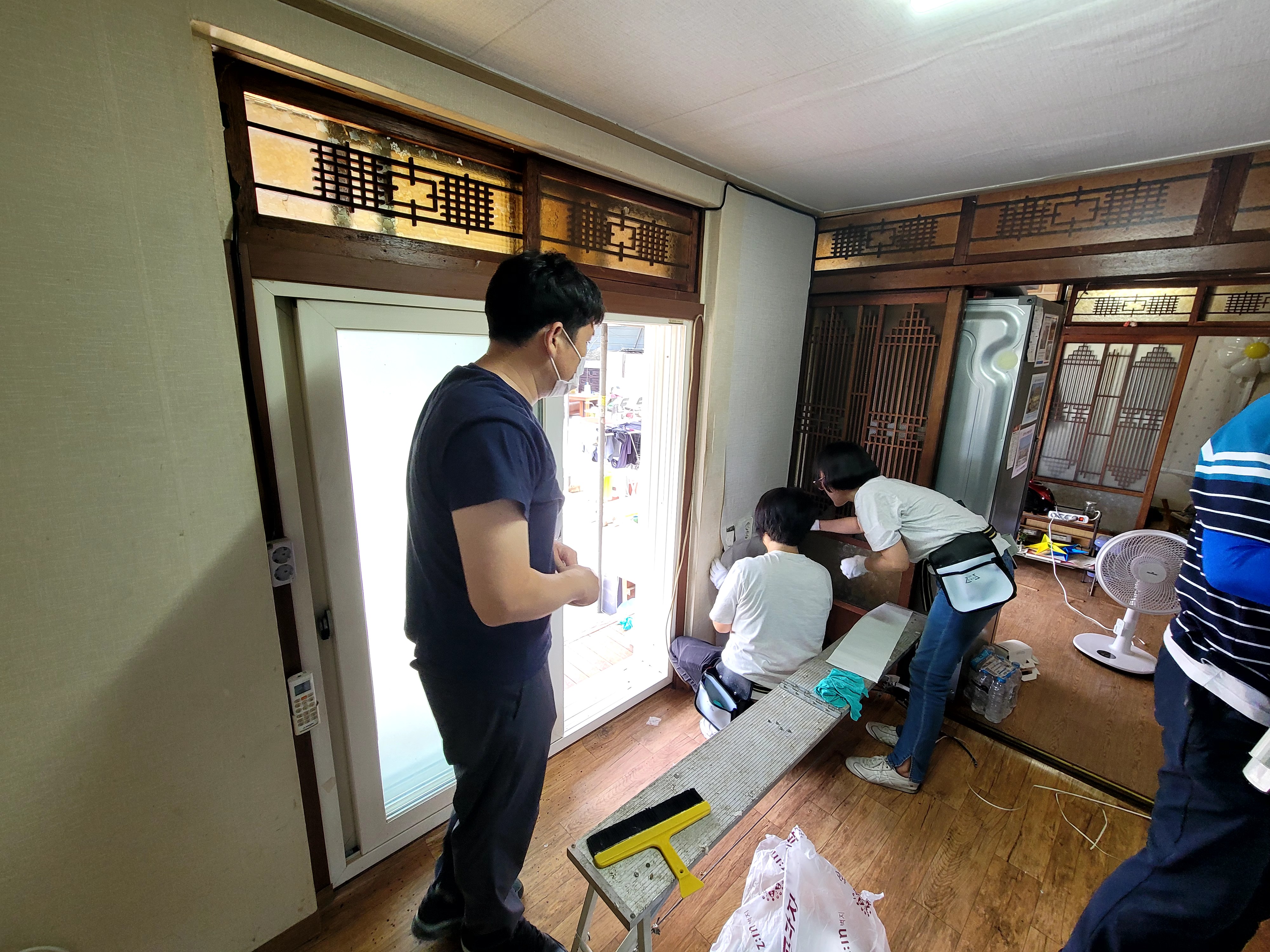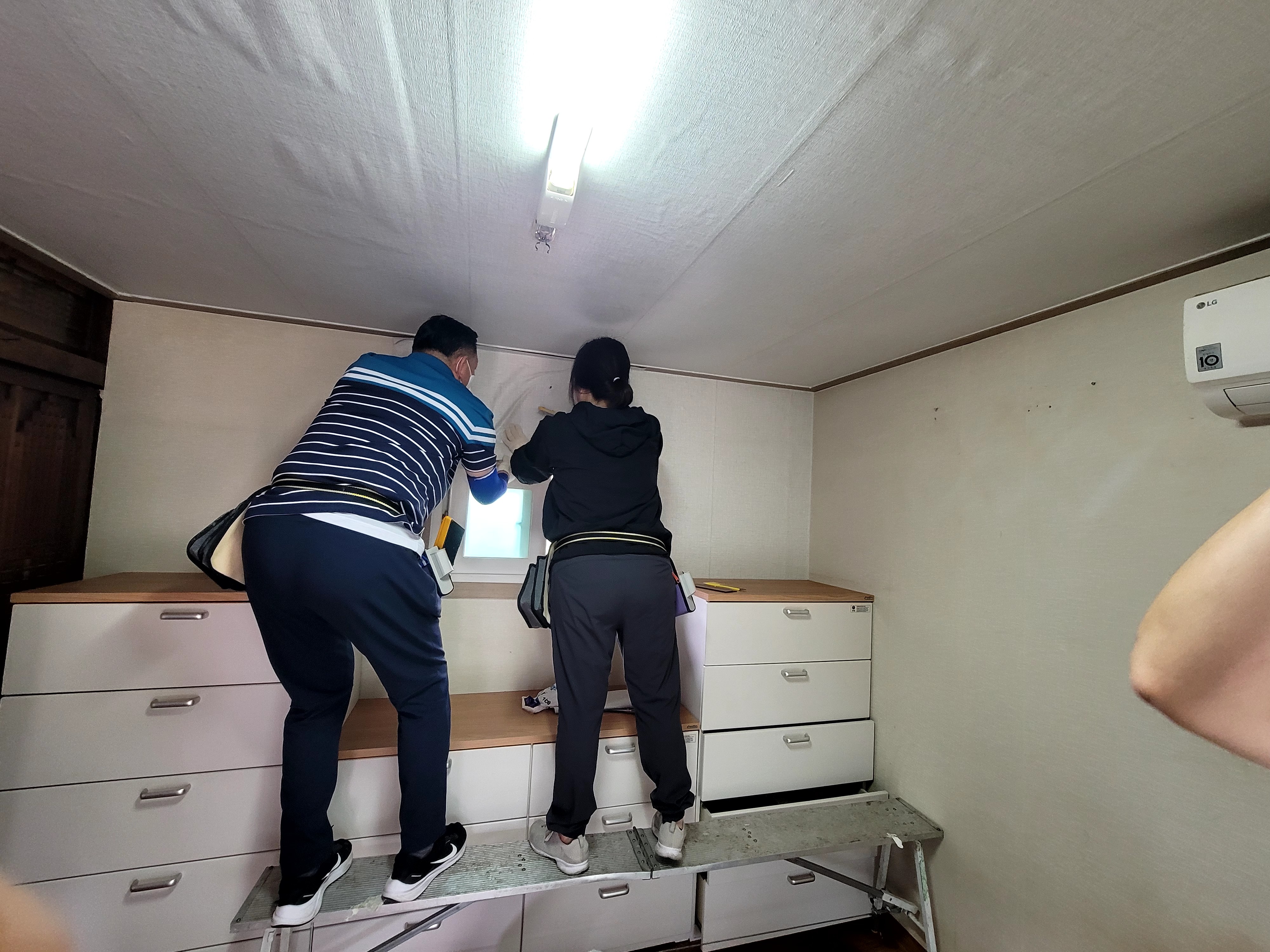 평생교육 도배반 수업이 화양의 독거어르신댁 방을 수강생을이 직접 치수재기, 재단, 풀칠, 벽지바르기까지 현장학습을 실시 하였다.