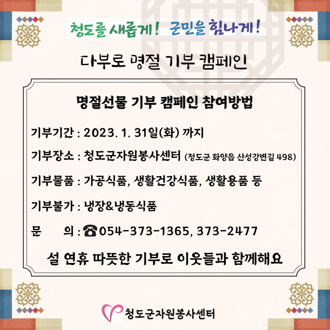 | 9 | (청도군자원봉사센터) 다부로 명절 기부 캠페인 | 관리자 | 2023.01.20 | 472 | ![]() |